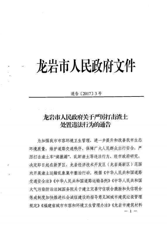 龍巖市人民政府關于嚴厲打擊渣土處置違法行為的通告(通告【2017】3號)